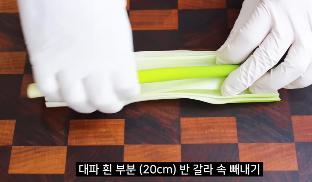 대파의 흰 부분을 20cm 정도 잘라서 반을 갈라줍니다.