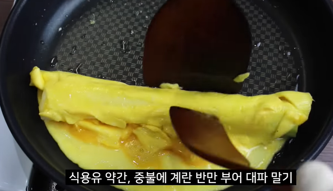 한 번 다 말고 나면 나머지 계란물을 붓고 또 말아줍니다.