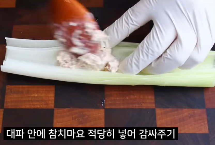 속을 파놓은 대파 안에 참치마요를 적당히 넣어서 감싸줍니다.