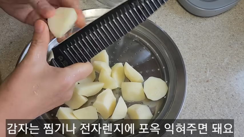 감자는 껍질을 벗기고 익기 좋게 작게 토막내줍니다.