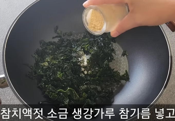 팬에 미역을 넣고 참지액젓, 소금, 생강가루, 참기름을 넣고 다진마늘은 옵션입니다.