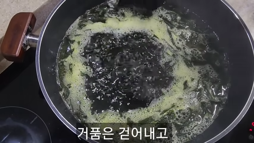 익힌 미역에 뜨거운 물을 부어 끓여줍니다.