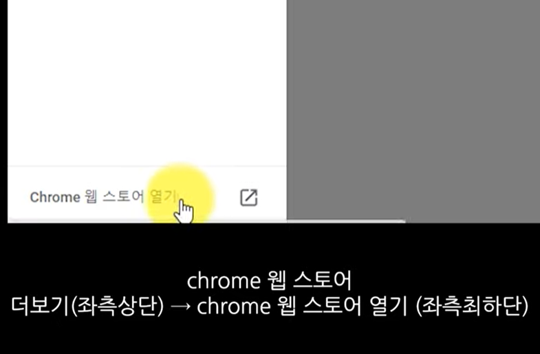 그런 다음 좌측상단 더보기 메뉴를 누르시고, 가장 하단에 있는 크롬 웹스토어 열기를 클릭해 주시면 됩니다.