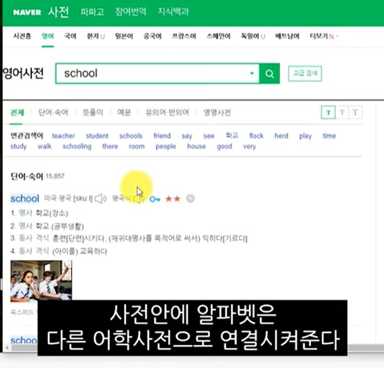 자막의 단어위에 마우스를 올리게 되면 간단한 뜻이 팝업되는데, 해당 단어를 클릭하게 되면 좀 더 디테일하게 사전적 의미와 함께 음성발음이 제공됩니다. 또한 사전안에 알파벳을 클릭 하면 각 사이드의 어학사전으로 연결을 해 줍니다.