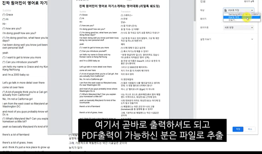 그런 다음 파란색으로 된 내보내기를 누르시게 되면 대본이 뜨게 되는데, Ctrl+P 또는 마우스 오른쪽을 클릭하시면 출력도 가능하고, PDF출력이 되신다고 하면 파일로도 추즐이 가능하다고 합니다.