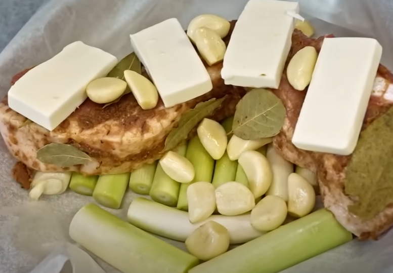 6. 대파를 깔아주고 삼겹살, 월계수 잎, 통마늘, 버터를 올려줍니다.