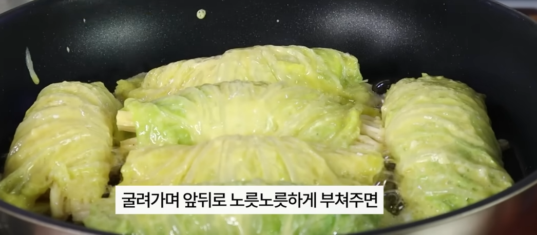 식용유를 두르고 잘 달궈지면 배추말이를 노릇하게 익혀줍니다.