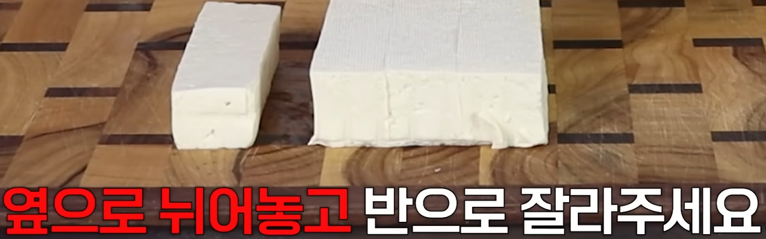 그리고 토막낸 것을 가로로 뉘어 반을 썰어주면 딱 좋은 싸이즈의 두부스틱이 됩니다.