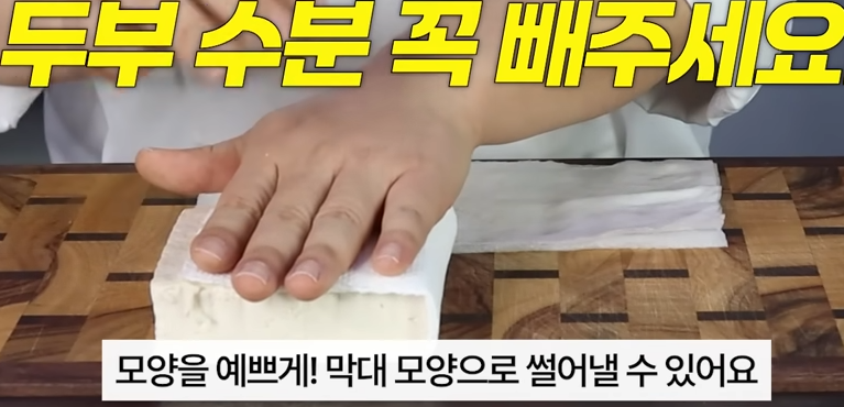 부침 두부로 구매해 주시고요 이제는 막대 모양으로 예쁘게 썰어 줄 겁니다