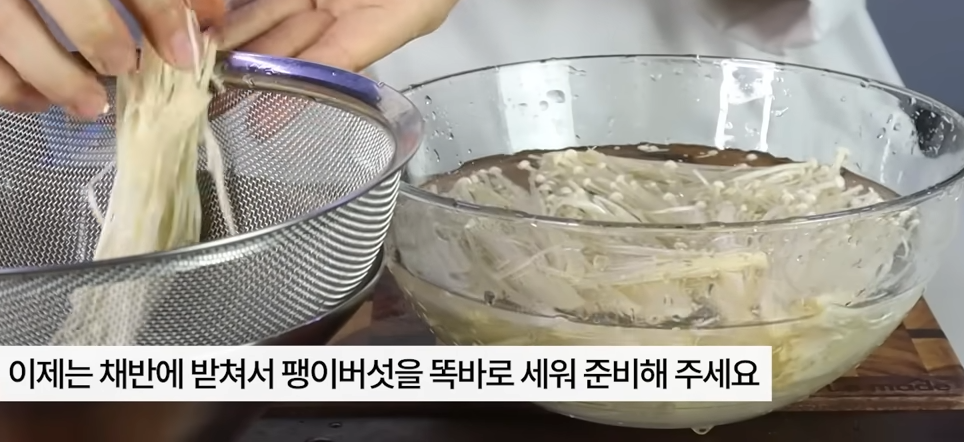 채반에 팽이버럿을 세워 물기를 뺴줍니다.