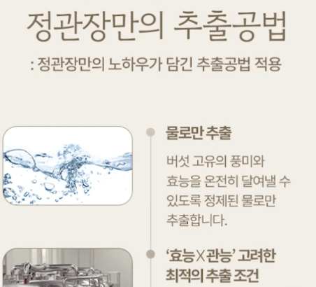 뿐만 아니라 추출공법도 정관장의 노하우가 담긴 추출 공법을 적용해 버섯 고유의 풍미와 효능을 온전히 담아낼 수 있도록 정제된 물로만 추출했다는 겁니다.