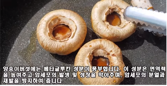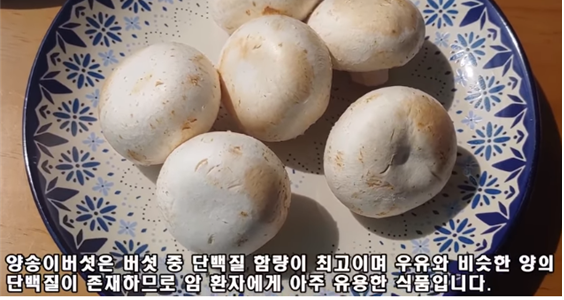 또 양송이 버섯에 들어있는 폴리페놀 성분은 폐암과 피부암, 대장암에 효과적이며, 체내 단백질 소모량이 큰 암환자에게 아주 귀한 식재료입니다.