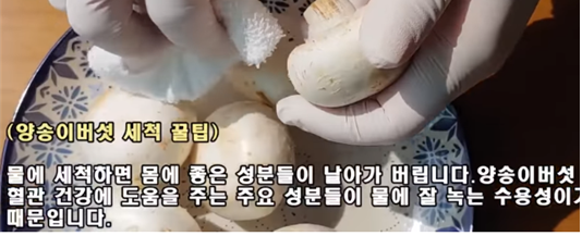 위에도 언급했듯이 우리가 일반적으로 알고 있는 것과 달리 양송이버섯은 기둥까지 드시는 것이 좋으며, 수용성 성분이 물 세척시 녹을 수 있으므로 마른 헝겊으로 표면을 닦고 그대로 드시는 것을 권합니다.