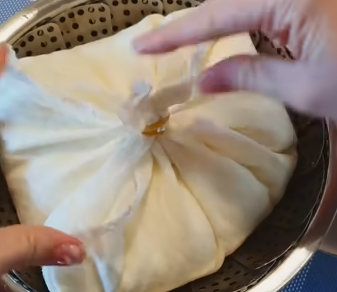 2. 모두 부었다면 이제 물기가 잘 빠져나갈 수 있도록 조심히 면보의 네면 끝을 잡고 보자기를 만들듯 중심으로 모아 고무줄로 묶어줍니다.