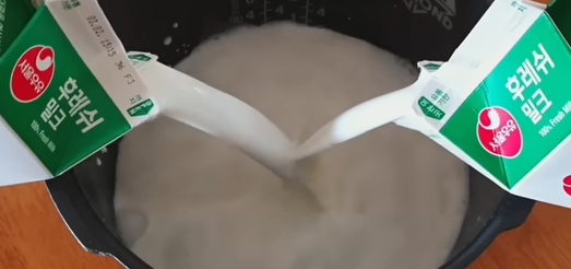 1. 우유 두 팩을 전기밥솥에 모두 부어줍니다.