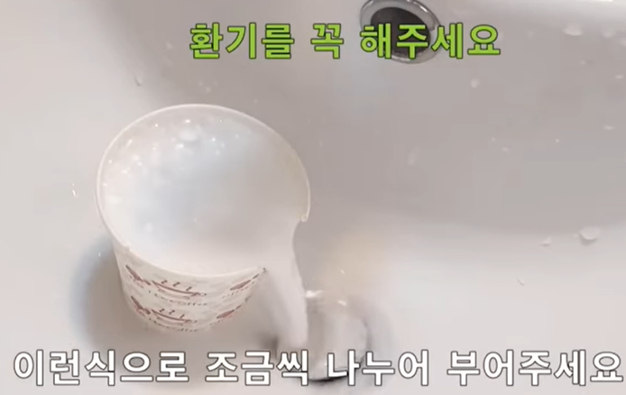 이런식으로 부어주면 뜨거운 물이 배관쪽으로 흘러 들어가게 되면서 배관에 달라붙은 찌꺼기들을 깨끗하게 청소를 해줍니다.
