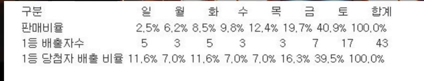 로또 판매 요일별 판매량과 1등 당첨자 수의 비율을 분석해본 결과, 예상외로 일요일과 화요일에 구매한 복권의 당첨 확률이 상대적으로 높게 나타났습니다.