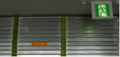 불길을 막기 위해 자동으로 내려오는 방화셔터에는 몸으로 밀면 열리는 부분이 있습니다. (비상구쪽, 야광 표시됨)
