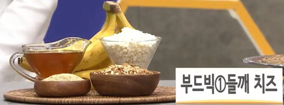 [재료_ 코티지치즈 4스푼 (60g), 들기름 2스푼 (10g), 들깻가루 1스푼 (5g), 아몬드 플레이크 1스푼 (5g), 바나나 1개 (85g)]