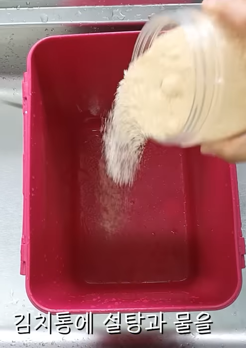김치통에 설탕과 물을 1:3의 비율로 희석하여 넣고 뚜껑을 덮은 후 뒤집어 반나절 정도 놔둡니다.