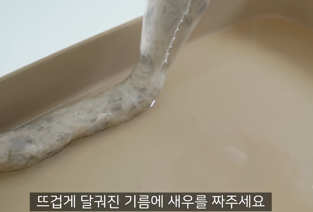 그리고 달궈진 기름에 새우를 한줄씩 짜주세요.