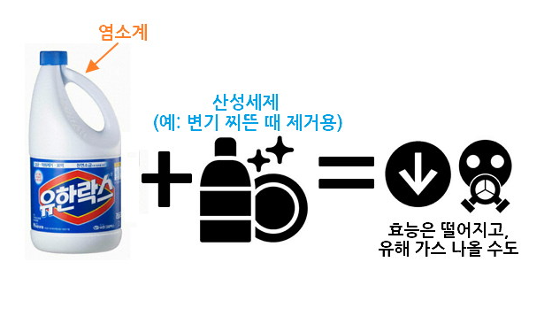 하지만 락스와 산성 세제(흔히 변기 찌든 때 제거용 세제)를 혼합하시면 사용하신 산성 세제의 세정력은 떨어지고, 락스의 살균력은 중화되어 사라지며 인체에 유해한 가스가 나올 수 있습니다.