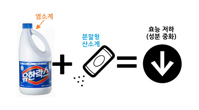 락스와 산소계 표백제를 혼합하면, 강한 발열 반응(반응 시 열이 발생)과 함께 산소가 발생되며 양쪽 활성 성분이 모두 분해되어 효능이 떨어집니다.