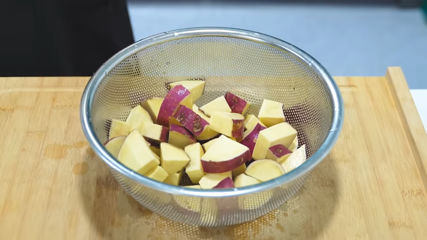 볼에다가 담아 고구마에 물을 부어주어 전분을 헹구듯이 해서 건진 뒤 키친타올이나 마른 행주로 물기를 제거해주세요.
