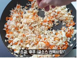 야채가 잘 볶아지면 현미밥을 한 스푼 넣고, 소금과 후추로 간단하게 양념해주세요.