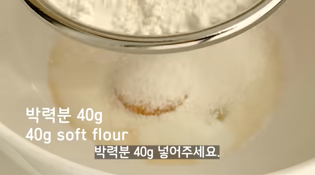 그리고 박력분 40g을 채에 쳐서 곱게 내려주세요.