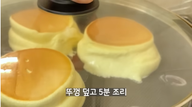 뒤집은 팬케이크 역시 5분을 조리하는데 물 한스푼을 팬에 올려줍니다.