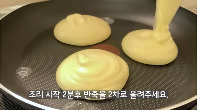 수플레 팬케이크는 도톰한게 생명이기 때문에 반죽을 두번에 나누어 올려줄겁니다.