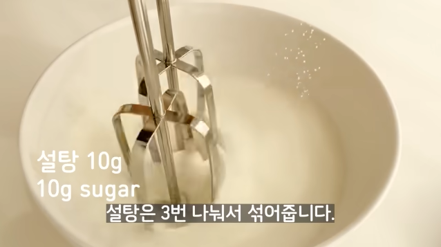그리고 설탕 10g을 준비하고 3번에 나누어 조금씩 넣어가며 섞어줍니다.