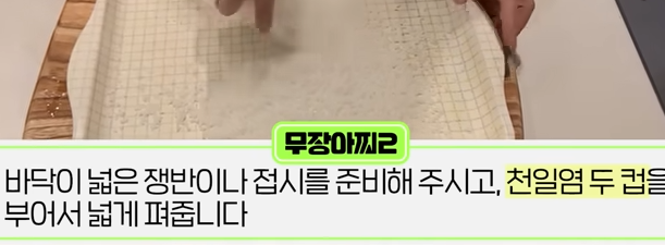 바닥에 넓은 쟁반이나 접시 준비해 주시고 천일염 한 컵 한 2컵 정도 부어주세요