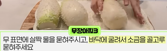 물이 묻은 무에 소금이 잘 묻게 자 이렇게 굴려 주시면 됩니다.