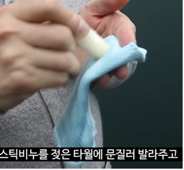 스틱비누를 젖은 타월에 문질러서 발라줍니다.