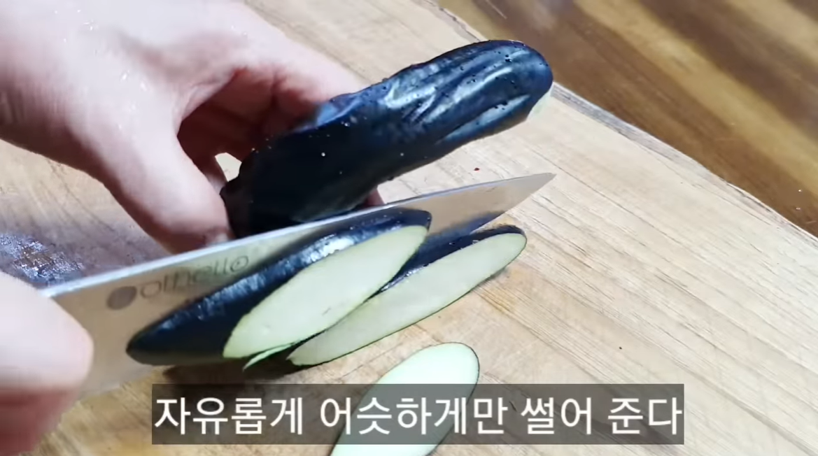 가지 8개를 자유롭게 어슷썰기로 썰어줍니다.