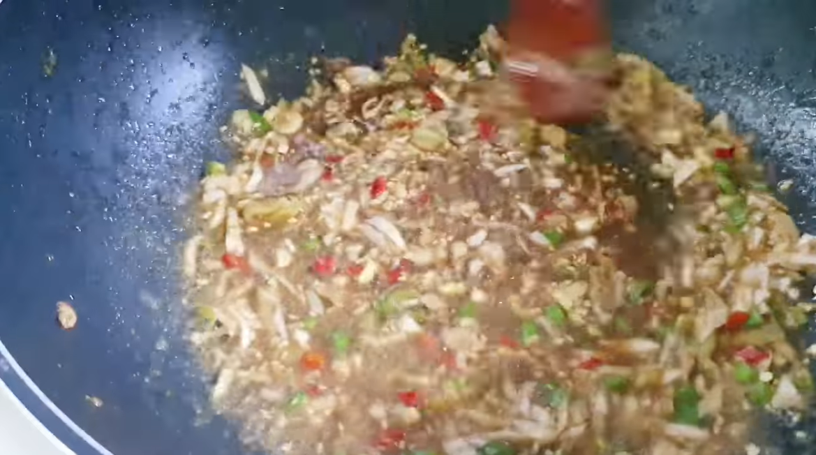 만들어 둔 양념장을 프라이팬에 붓고 30초간 졸여줍니다.