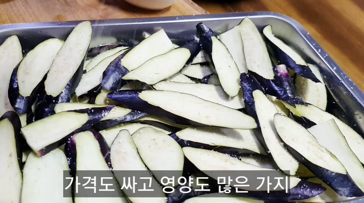 이렇게 소금을 뿌리면 수분이 빠져나가 쫄깃한 식감의 가지가 됩니다