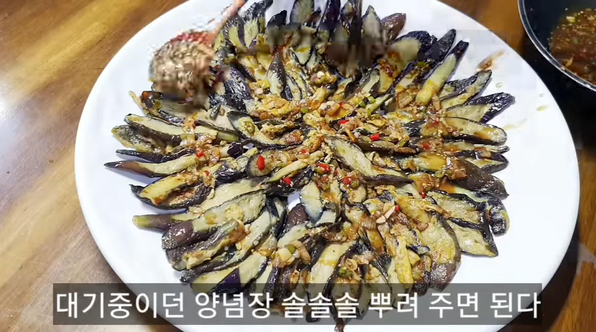 접시에 담아둔 가지위에 졸인 양념장을 부어줍니다