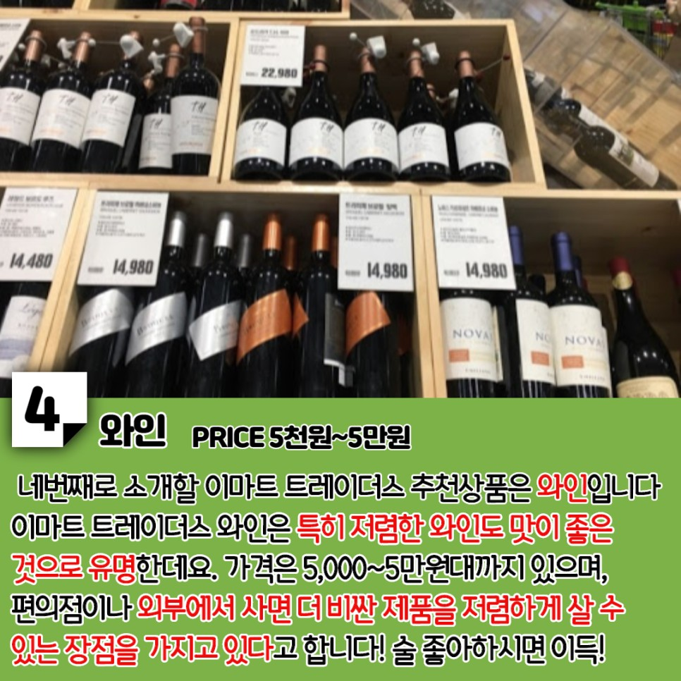 주로 5,000원 대에서 5만원대까지 있는 와인들은, 값싼 와인을 사도 맛이 좋으며 밖에서는 이 가격대보다 훨씬 비싸게 받고 판다고 합니다. 따라서 와인이 땡길때 이마트 트레이더스 와인을 구매하는 것도 좋다고 해요