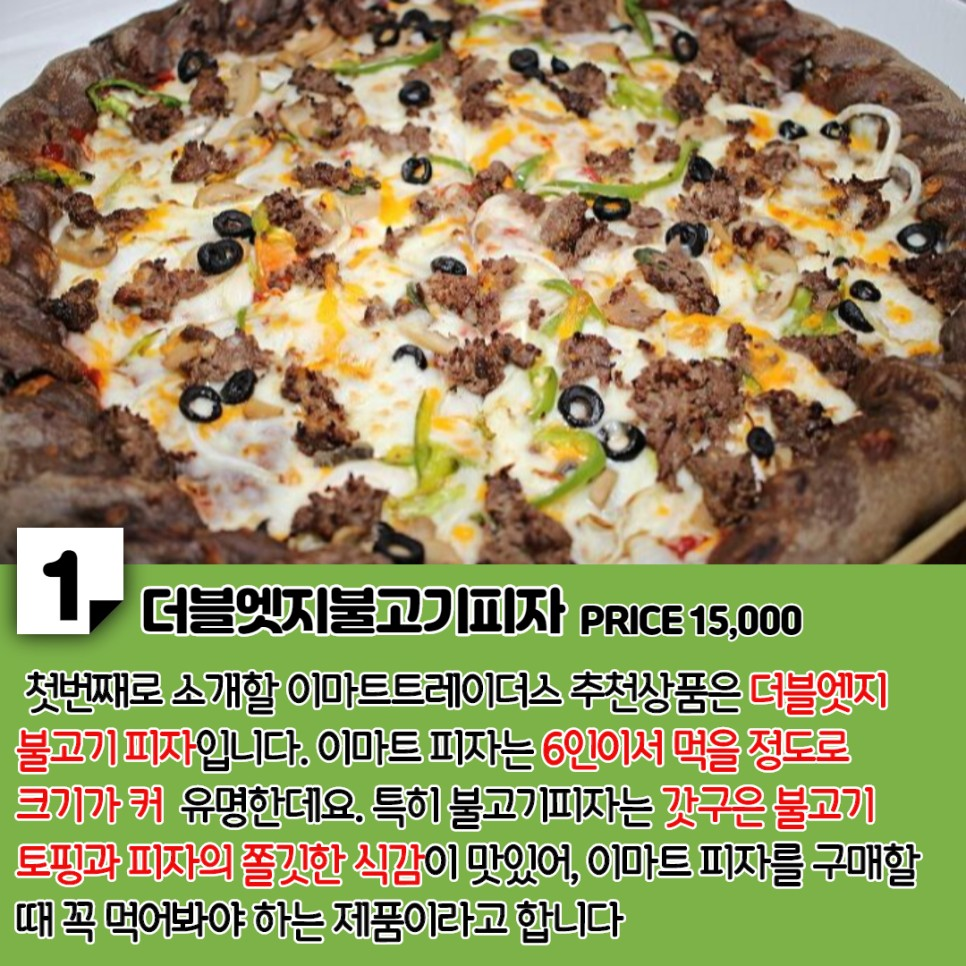 특히 다양한 피자 중에서도 더블엣지불고기피자는 그 맛과 토핑의 일품이기 때문에 꼭한 번 가면 사서 와야하는 피자로 유명합니다.