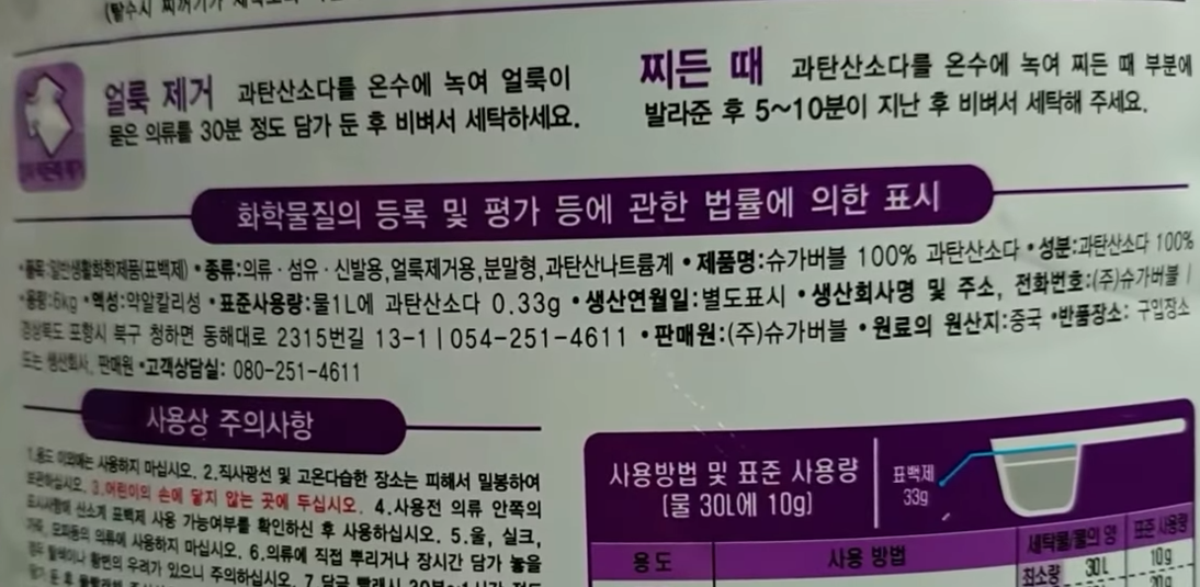 뒷면에 보시면 표준사용량이 물 1L에 과탄산소다 0.33g이라고 표기되어 있으니 주의사항을 잘 읽어보시고 사용하도록 합니다.