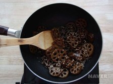 2. 냄비에 물 1컵(200ml)과 양념 재료, 연근을 넣고 조린다.