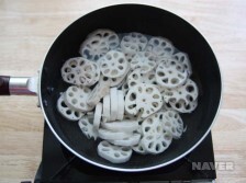 1. 연근 껍질은 벗기고 0.5cm 두께로 썬다. 냄비에 물 1컵(200ml), 식초, 연근을 넣고 연근이 반쯤 익을 때까지 데친다. 체에 밭쳐 물기를 뺀다.(연근을 식촛물에 데처내어 아린맛을 없애고 조리는 시간을 줄일 수 있다.)