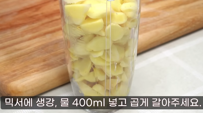 믹서에 생강, 물 400ml 넣고 곱게 갈아주세요.