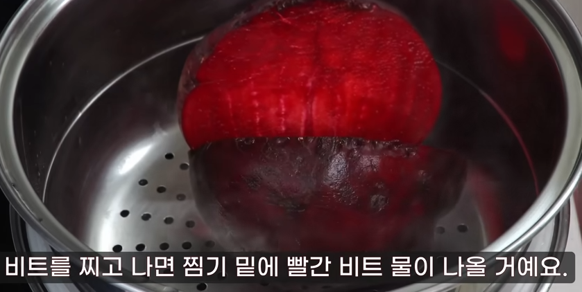 비트를 찌고 나면 찜기 밑에 빨간 비트 물이 나올 거예요.