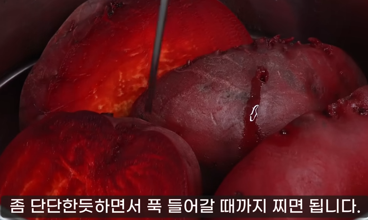 찜기에 물이 끓으면 비트 넣고 센 불로 익을 때까지 찌면 돼요.