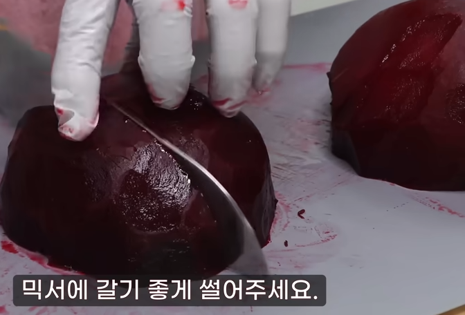 그냥 넣으면 부피를 많이 차지하기 때문에 한 번에 많은 양을 넣어 빠르게 갈기 위해서는 썰어 넣는 것이 좋아요.