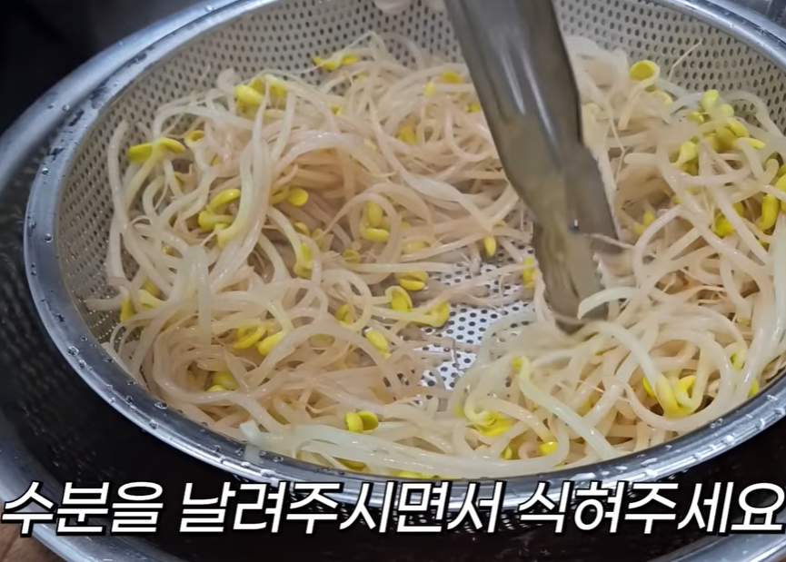 삶은 콩나물을 채반에 옮겨주고 수분을 날려줍니다.